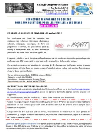 Le collège Auguste Mignet annonce une fermeture temporaire et propose des activités ludiques pour les élèves pendant les vacances. Toutes les épreuves du brevet des collèges sont annulées, et l'évaluation se basera sur le contrôle continu et le livret scolaire. Les parents et élèves sont informés que les conseils de classe se dérouleront via visio-conférence en fonction de la situation de confinement.
