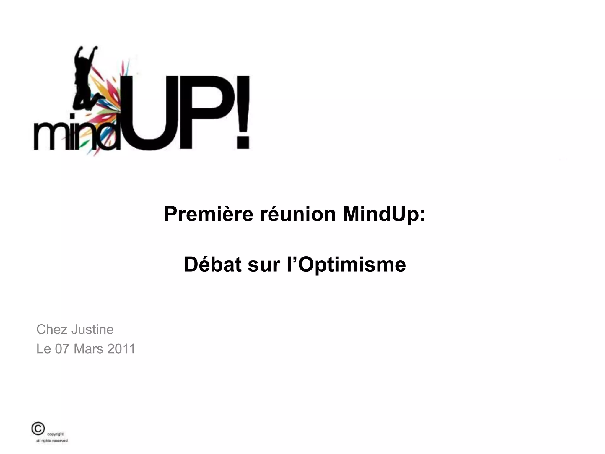 La première réunion de Mindup, tenue le 7 mars 2011, a porté sur l'optimisme et a rassemblé divers intervenants pour discuter de son impact sur le bonheur et le succès personnel. Mindup est une organisation qui vise à promouvoir le développement personnel à travers des débats, des conférences et des groupes de travail. Les participants ont exploré les thèmes de l'optimisme en tant que potentiel ou déni de réalité, ainsi que l'influence de la pensée positive sur le succès.