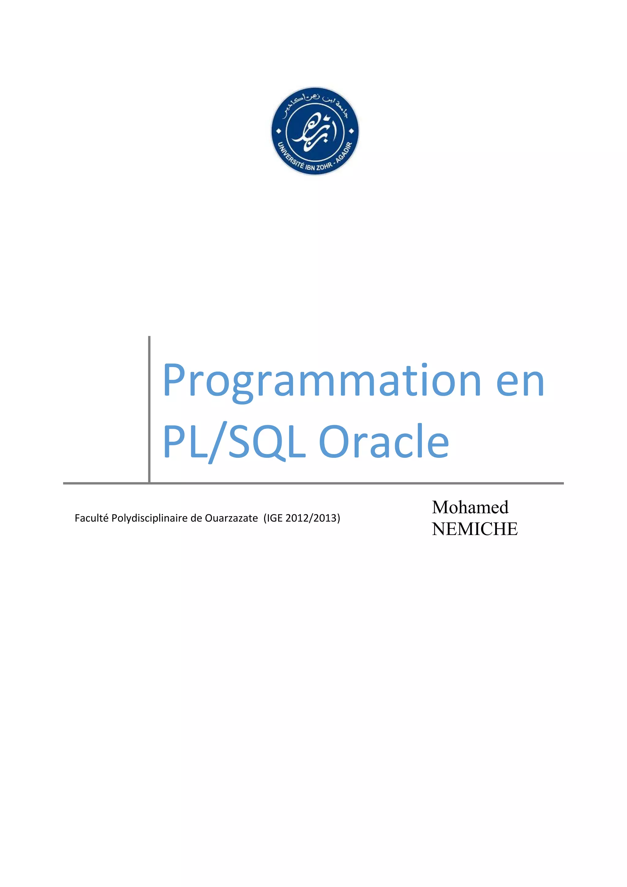Le document est un guide sur la programmation en PL/SQL Oracle, structuré en plusieurs chapitres traitant des blocs PL/SQL, des traitements conditionnels, des curseurs, de la gestion des erreurs, des procédures, et des déclencheurs. Il souligne l'importance de PL/SQL dans l'interaction avec Oracle, facilitant la création de programmes modulaires qui peuvent être stockés et exécutés sur le serveur de base de données. Le langage permet de gérer les données de manière efficace en intégrant des structures de contrôle et de gestion d'exceptions.
