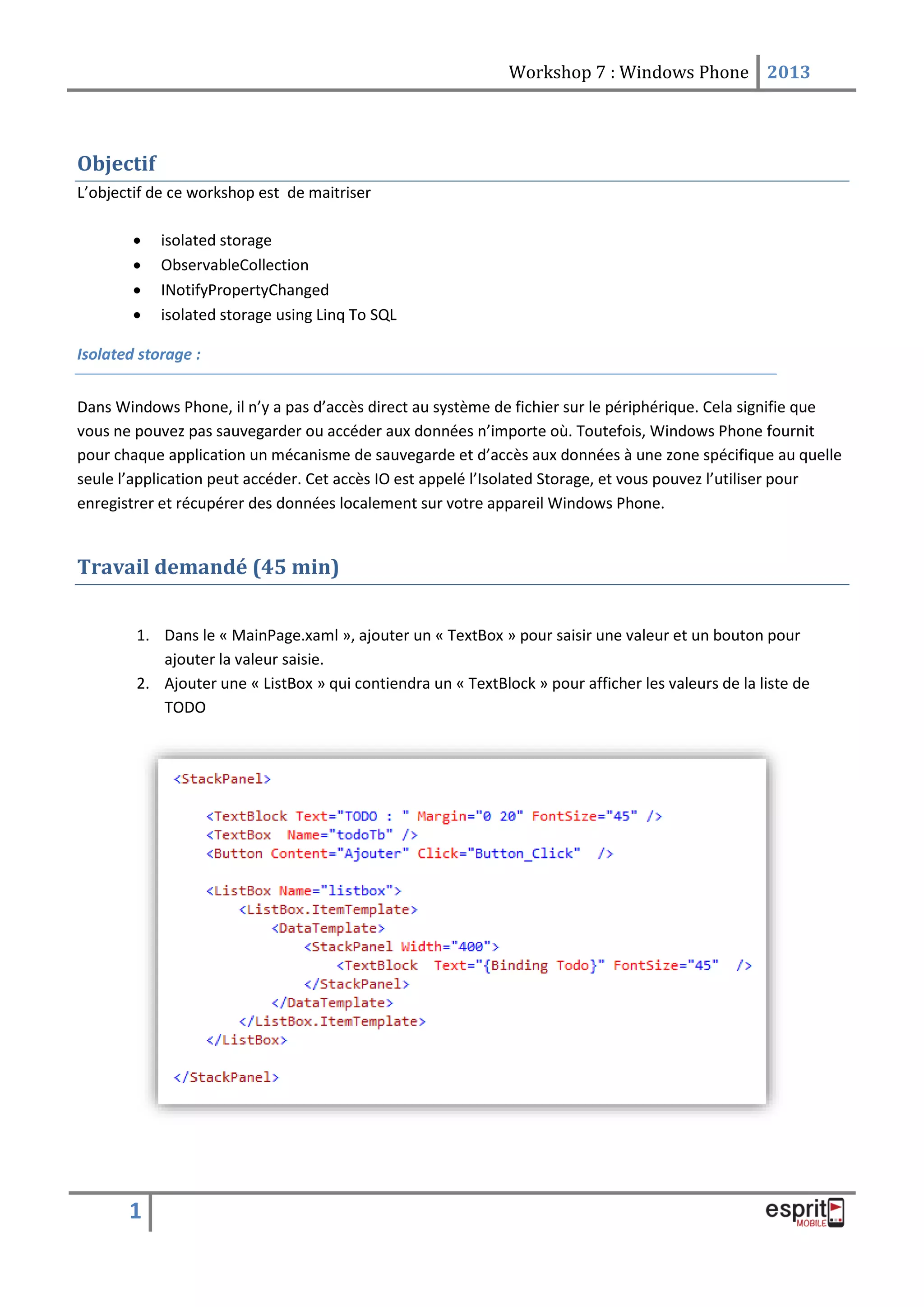 Ce workshop sur Windows Phone 2013 enseigne comment utiliser le stockage isolé pour gérer les données d'application. Les participants apprendront à créer une interface utilisateur avec des éléments comme des textbox et listbox, ainsi qu'à mettre en œuvre des fonctionnalités avec des collections observables et l'interface INotifyPropertyChanged. Des méthodes pour gérer les opérations CRUD sur les données stockées localement seront également définies, y compris la conversion entre objets et JSON.