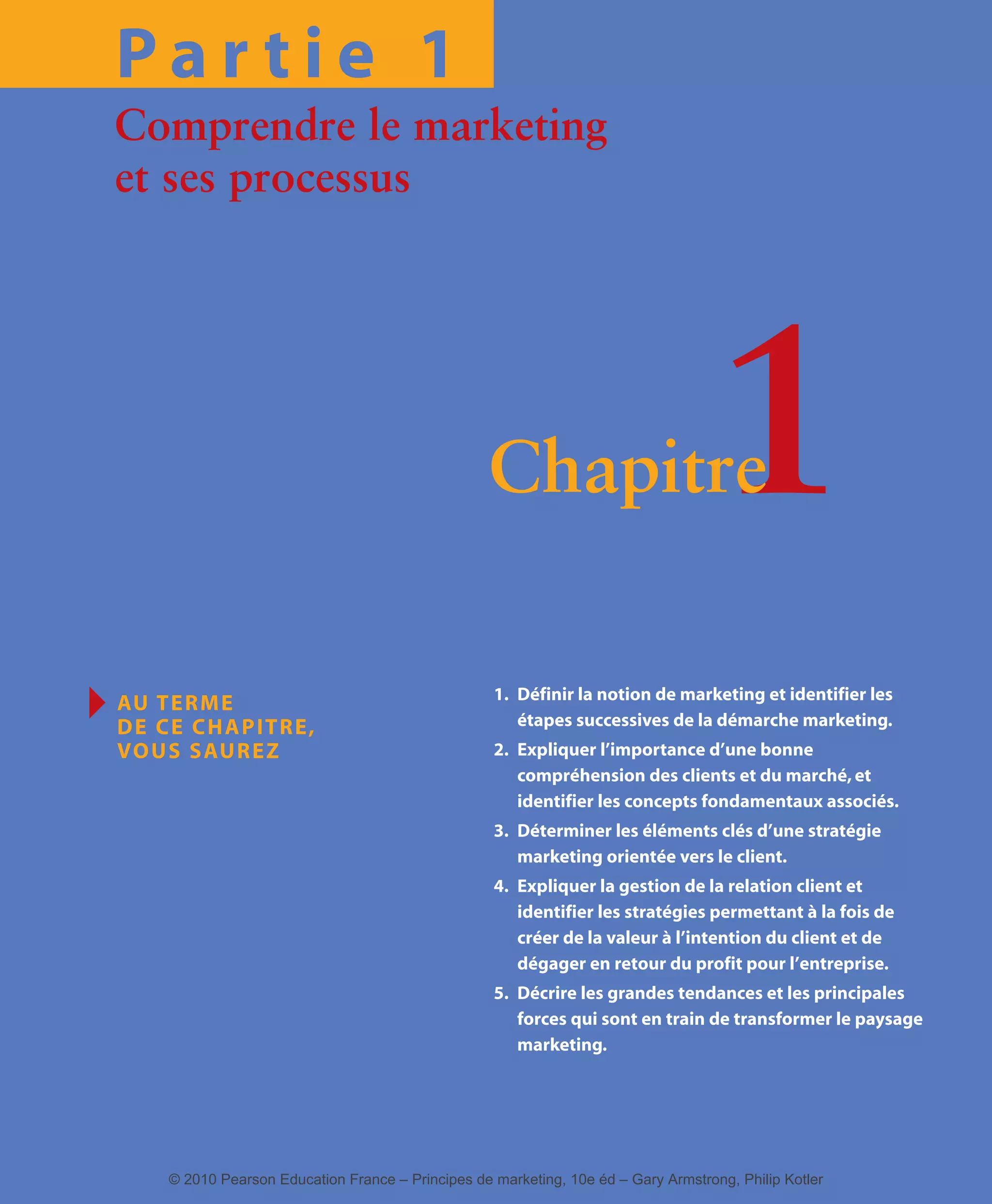Le chapitre 1 introduit le marketing en tant que processus visant à créer des relations rentables entre les entreprises et leurs clients en répondant à leurs besoins et désirs. Il souligne l'importance d'une compréhension approfondie des clients et du marché, ainsi que de la gestion de la relation client pour générer de la valeur. En définitive, le succès en marketing repose sur la capacité à établir des liens durables qui favorisent la satisfaction client et la rentabilité de l'entreprise.