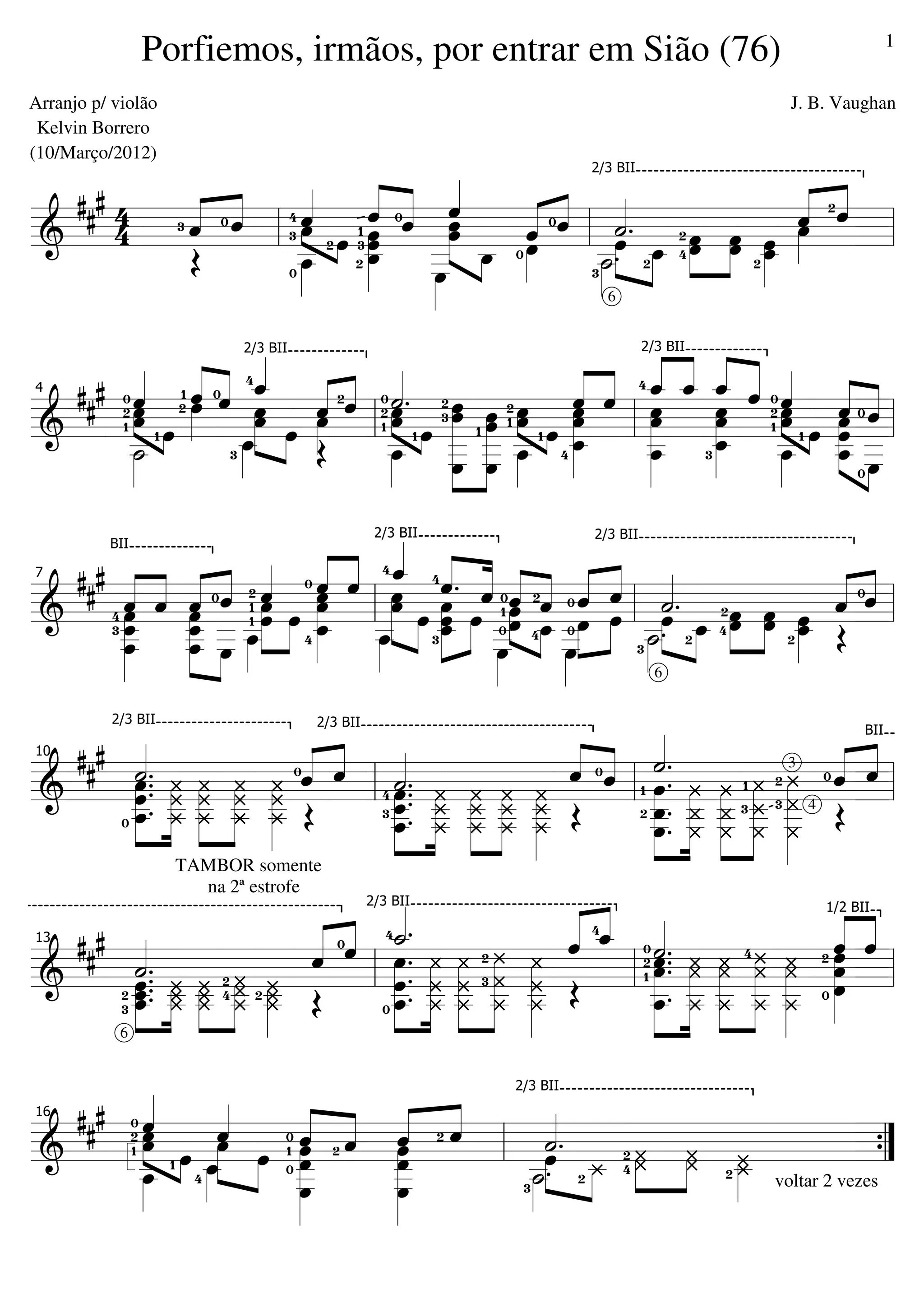 O documento é um arranjo musical para violão da canção "Porfiemos, irmãos, por entrar em Sião", datado de 10 de março de 2012, criado por J.B. Vaughan e Kelvin Borrero. Várias seções e símbolos musicais são apresentados, indicando uma estrutura complexa, que inclui partes de violão e segmentos temporais. Embora contenha trechos não totalmente claros, é voltado para performances ou arranjos musicais.