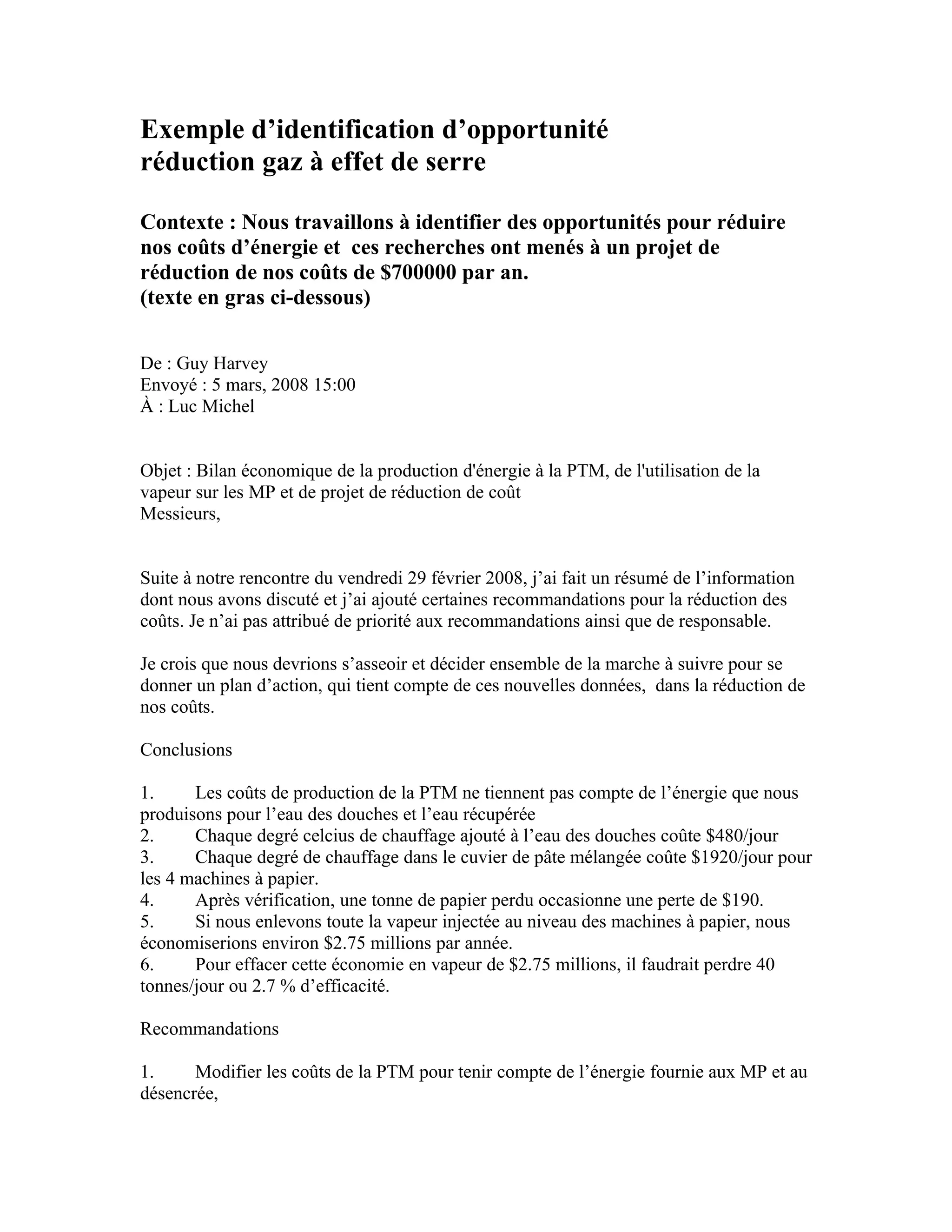 Le document présente des recommandations pour réduire les coûts énergétiques d'une production d'énergie, avec un objectif d'économie potentielle de plus de 2 millions de dollars par an. Il souligne des aspects économiques tels que les coûts associés à la température de l'eau pour les machines et propose des modifications techniques pour améliorer l'efficacité. Les conclusions indiquent que la production d'énergie actuelle est surévaluée en raison de la non-prise en compte de certaines énergies produites.