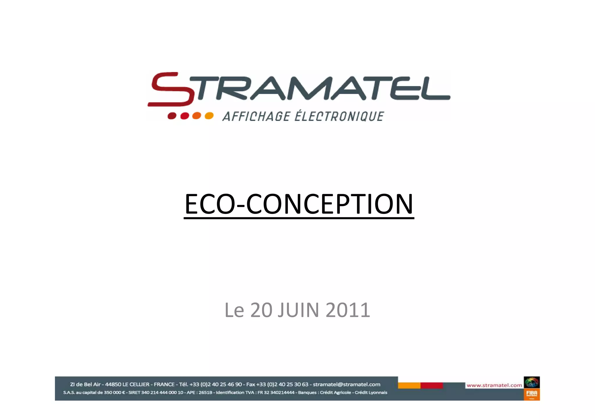 Stramatel, fondée en 1981 et leader en affichage sportif en France, a entrepris une démarche d'éco-conception pour réindustrialiser ses produits et réduire les coûts. L'étude a mis en évidence divers impacts écologiques de la production et de l'utilisation, aboutissant à des modifications significatives telles que la réduction du poids des batteries et l'utilisation de matériaux recyclables. Les résultats incluent un relookage complet du produit, une diminution de la consommation d'énergie et une augmentation de la productivité.