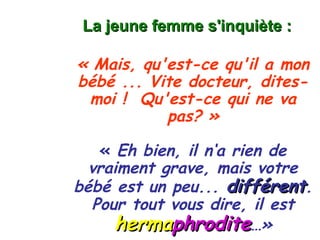 Une femme vient de donner naissance à un bébé et apprend du médecin que celui-ci est hermaphrodite, possédant des caractéristiques physiques des deux sexes. La mère, alarmée par cette nouvelle, ne comprend pas pleinement les implications. Bien que la situation soit délicate, l'échange prend une tournure comique à travers la réaction surprise de la mère.