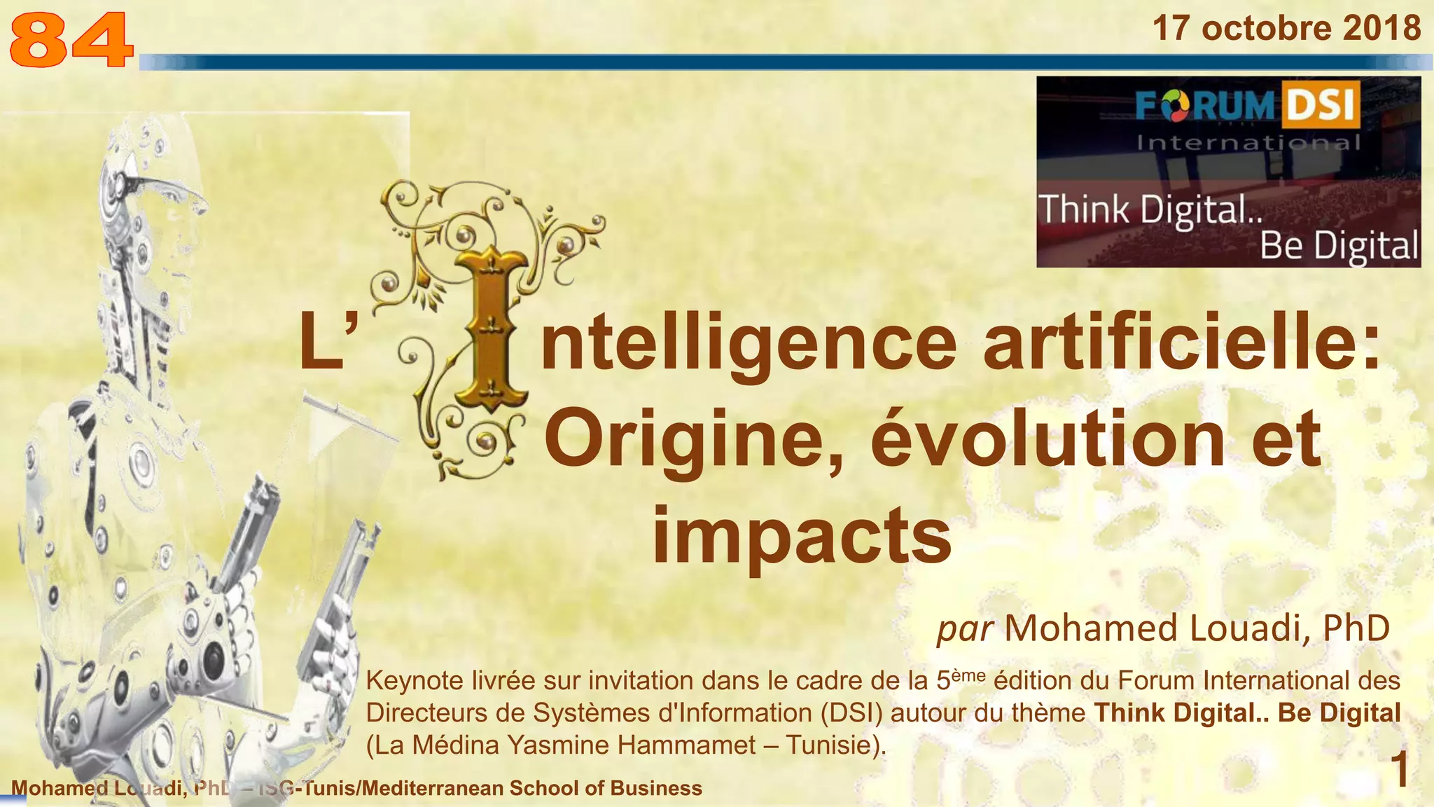 Dans une conférence, Mohamed Louadi aborde l'origine et l'évolution de l'intelligence artificielle, en soulignant son impact sur le travail et la société. Il discute des avancées technologiques telles que la blockchain et l'automatisation, ainsi que des différences dans les capacités cognitives des machines par rapport aux humains. Le document présente également des exemples concrets d'application de l'IA et des réflexions sur la nature de l'intelligence.