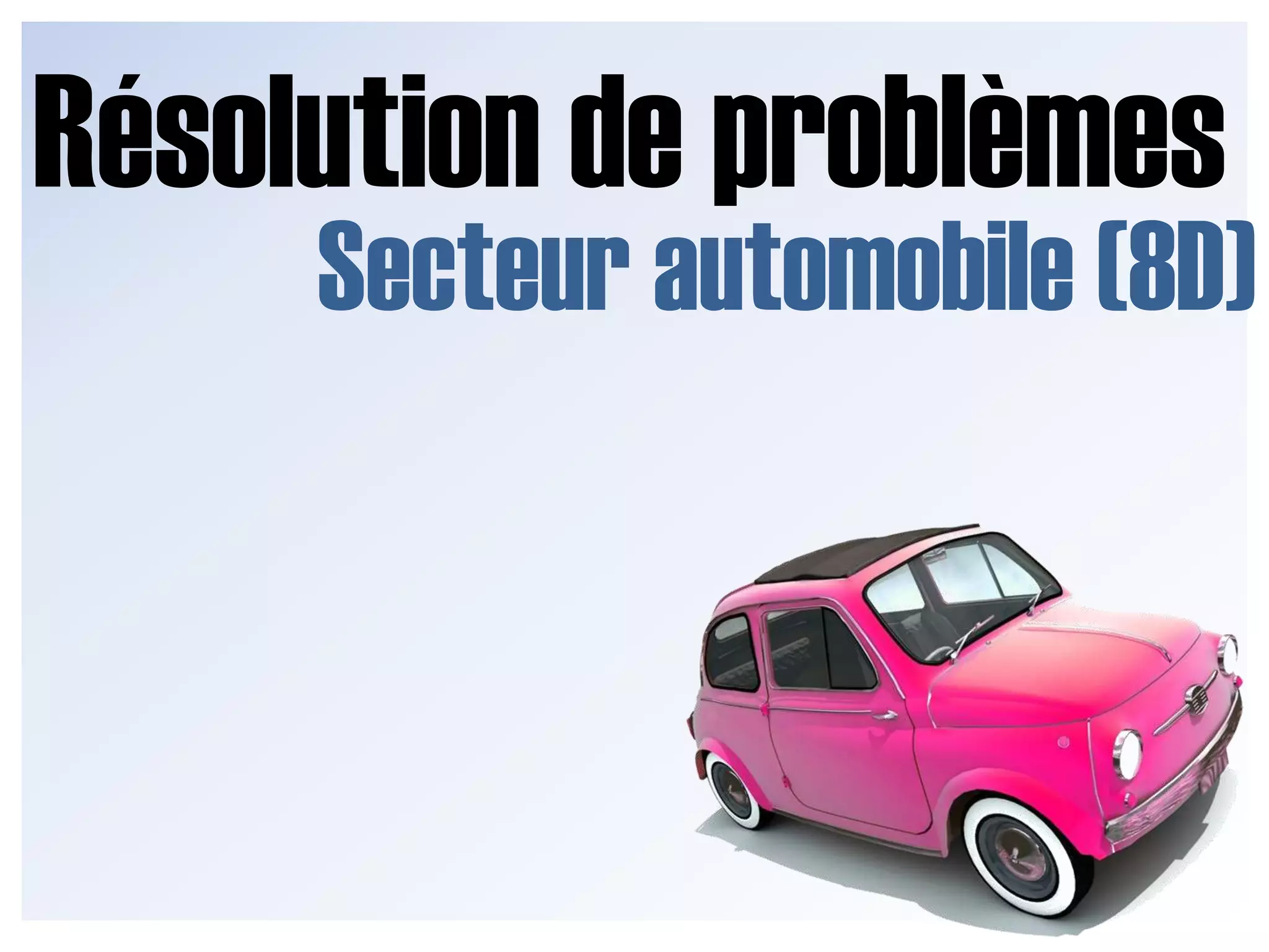 La présentation aborde la méthode 8D pour la résolution de problèmes dans le secteur automobile, qui consiste en 8 étapes systématiques allant de la constitution d'une équipe à la standardisation des solutions. Chaque étape nécessite une approche pluridisciplinaire et l'identification minutieuse des causes racines à l'aide d'outils tels que le diagramme d'Ishikawa et les 5 pourquoi. Le processus met l'accent sur la collaboration et la validation des solutions pour assurer une amélioration continue.