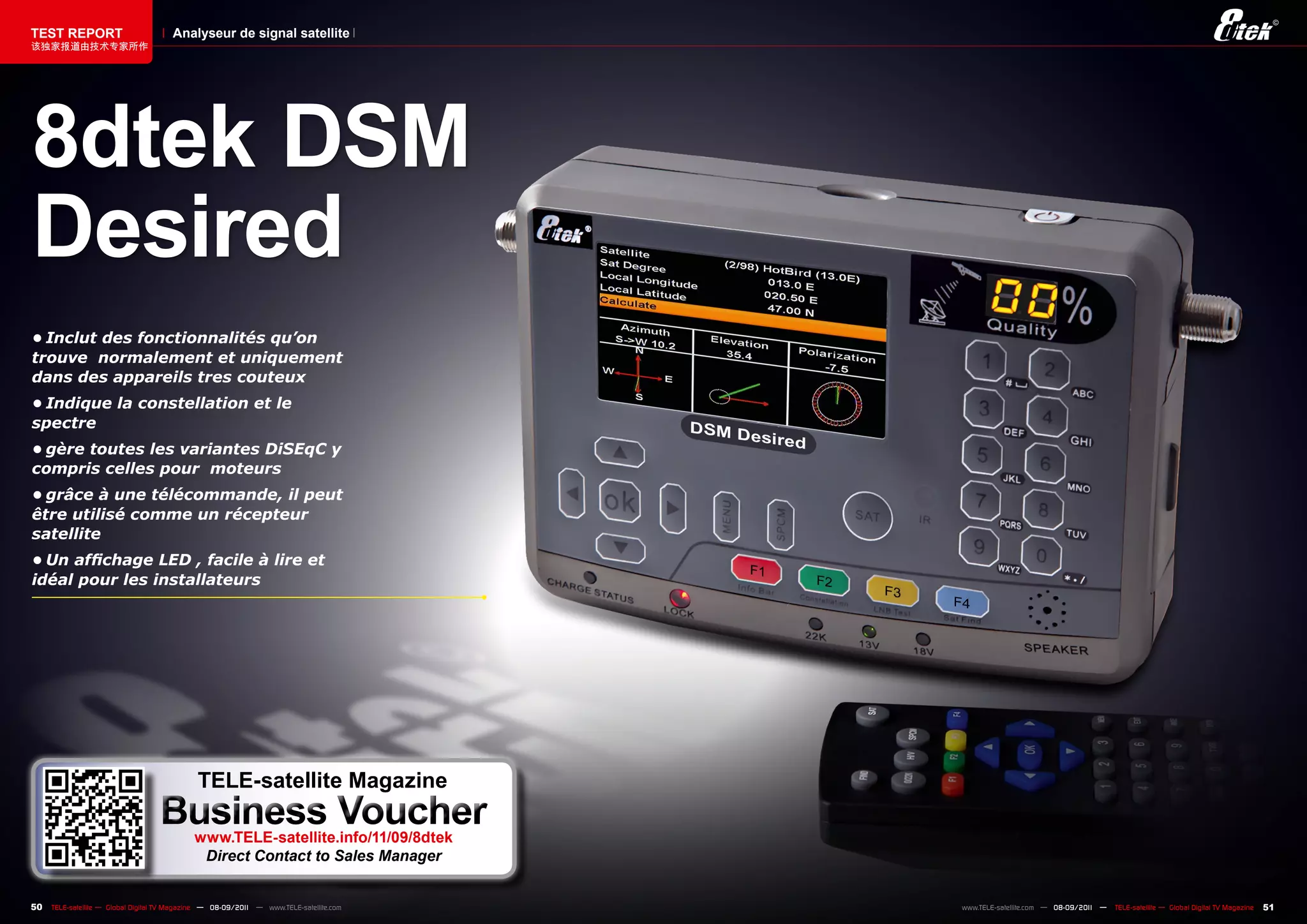 Le rapport d'analyse du test de l'analyseur de signal satellite 8dtek présente des fonctionnalités avancées généralement réservées à des appareils coûteux. Il permet de gérer diverses configurations et utilise une télécommande pour fonctionner comme un récepteur satellite. L'affichage LED est conçu pour être facile à lire, ciblant ainsi les installateurs.
