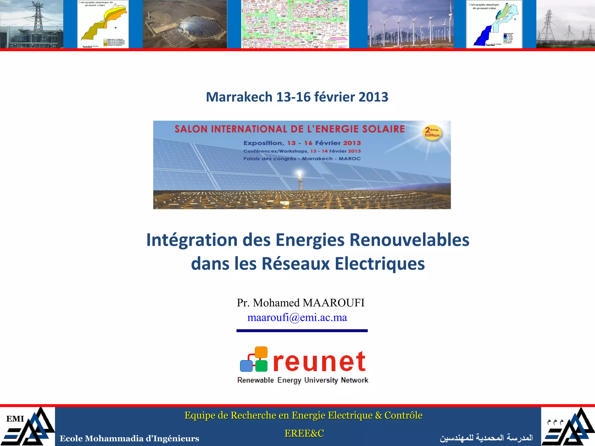 Le document traite de l'intégration des énergies renouvelables (ENR) dans les réseaux électriques, abordant les défis liés à leur intermittence et à leur dispersion géographique. Il présente les conséquences sur la conduite et le fonctionnement des réseaux, tout en proposant des solutions telles que le stockage d'énergie, l'efficacité énergétique, et l'utilisation de technologies avancées comme les réseaux intelligents. La conclusion souligne la nécessité d'investissements importants pour répondre à la croissance des besoins en électricité et la promesse des ENR pour l'avenir des infrastructures énergétiques.