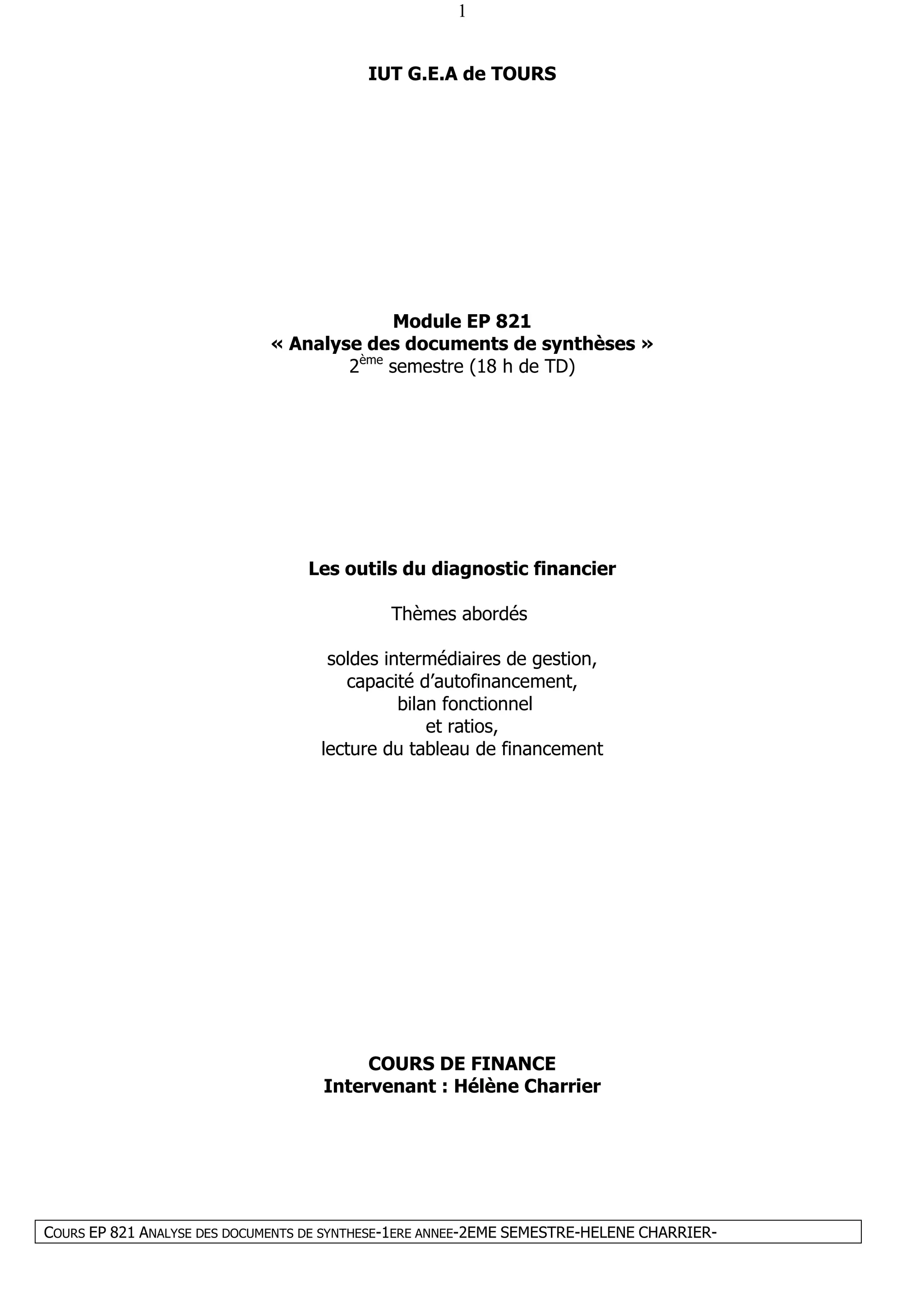 Le document aborde le module EP 821 d'analyse des documents de synthèse pour les étudiants de première année d'IUT, se concentrant sur les outils de diagnostic financier tels que les soldes intermédiaires de gestion, la capacité d'autofinancement et l'analyse des bilans. Il décrit la méthodologie d'analyse financière et l'interprétation des chiffres d'entreprise, tout en mettant l'accent sur l'importance de maîtriser les techniques de comptabilité financière. Le contenu se déroule sur plusieurs chapitres, fournissant des explications sur les comptes de résultats, les besoins de financement et l'équilibre financier.