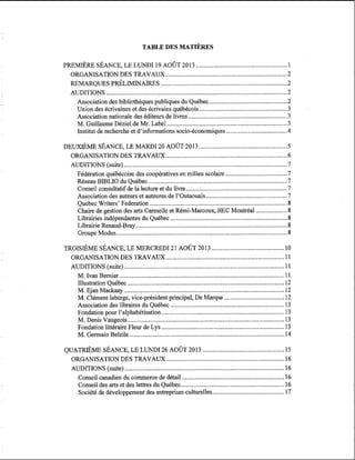 Le document détaille les auditions et consultations menées par la commission de la culture et de l'éducation de l'Assemblée nationale sur la réglementation du prix de vente des livres neufs, avec plusieurs séances organisées entre août et septembre 2013. Divers témoins, représentants d'organisations littéraires, bibliothèques, et coopératives y partagent leurs expériences et perspectives. Les séances incluent des échanges sur l'impact de la réglementation sur les acteurs de l'industrie du livre au Québec.