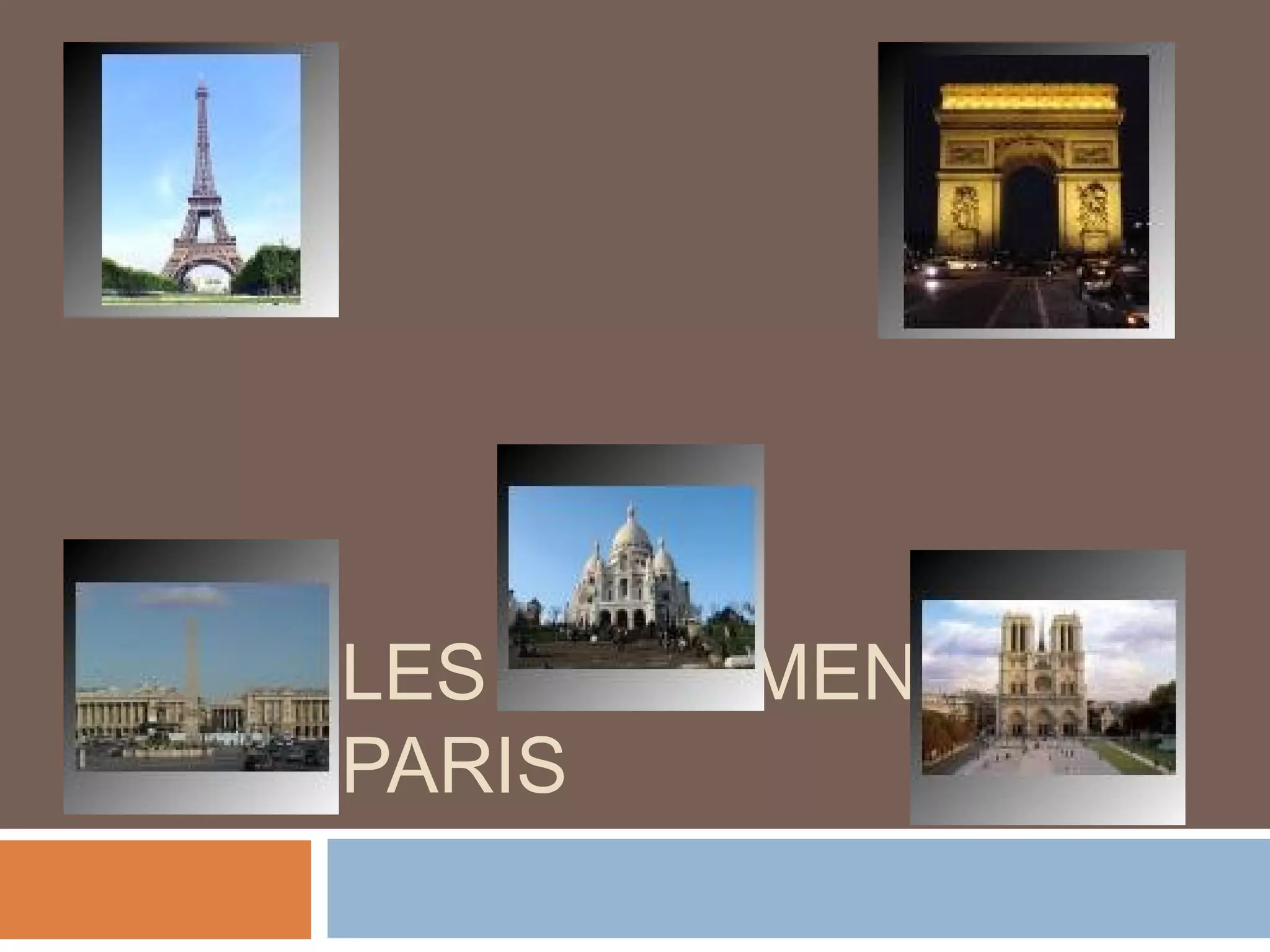 Le document présente les principaux monuments de Paris, tels que la Tour Eiffel, l'Arc de Triomphe, et la cathédrale Notre-Dame, en fournissant des informations sur leur histoire et leur importance. Il mentionne également des lieux emblématiques tels que les Champs-Élysées et le Centre Pompidou. La description met en avant l'architecture et l'impact culturel de ces sites dans la ville.