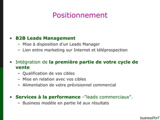 Le document présente les services de Businessperf, axés sur la génération de leads B2B, la qualification de données et la téléprospection. Il décrit les stratégies et outils utilisés, comme les campagnes de phoning, le marketing par e-mail et l'animation d'événements. Businessperf souligne son rôle de partenaire dans le cycle de vente, optimisant la mise en relation avec des décideurs et maximisant l'efficacité commerciale.