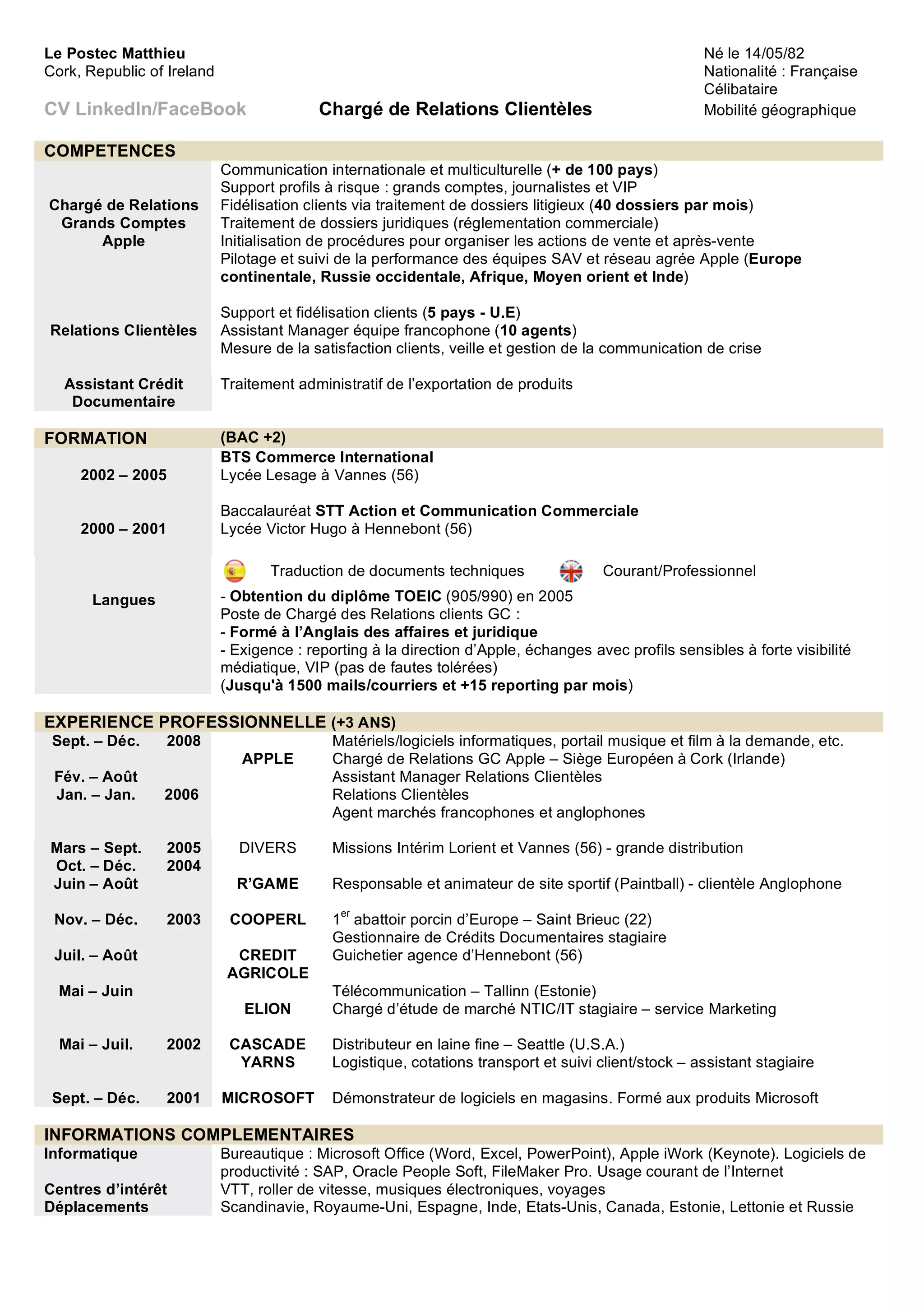 Matthieu Postec, né le 14/05/1982 en Irlande, est un chargé de relations clients avec une expérience internationale dans le support et la fidélisation de clients, notamment chez Apple. Il maîtrise l'anglais des affaires et a des compétences en communication interculturelle, traitant jusqu'à 1500 emails par mois. Son parcours professionnel inclut divers postes en gestion de la relation client et en administration dans plusieurs pays.