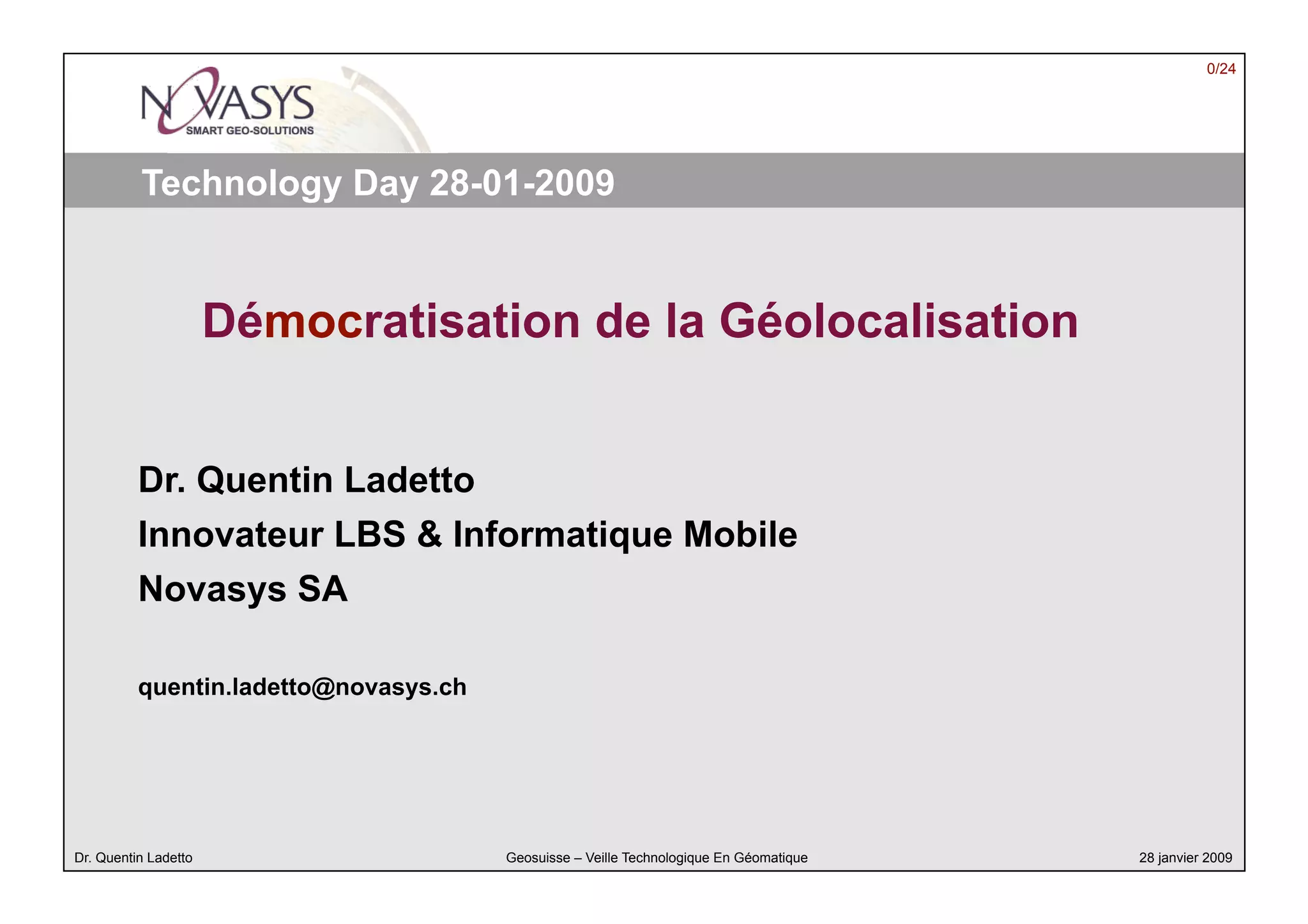 Le document présente un bilan technologique des systèmes de géolocalisation en 2009, notamment les avancées dans les récepteurs GPS, leur démocratisation et les impacts sur le marché. Il aborde les différents acteurs de cette évolution, ainsi que les conséquences positives et négatives de la disponibilité croissante des services de géolocalisation. Enfin, il met en lumière les défis futurs liés à la qualité, la continuité des services et l'innovation dans ce domaine.
