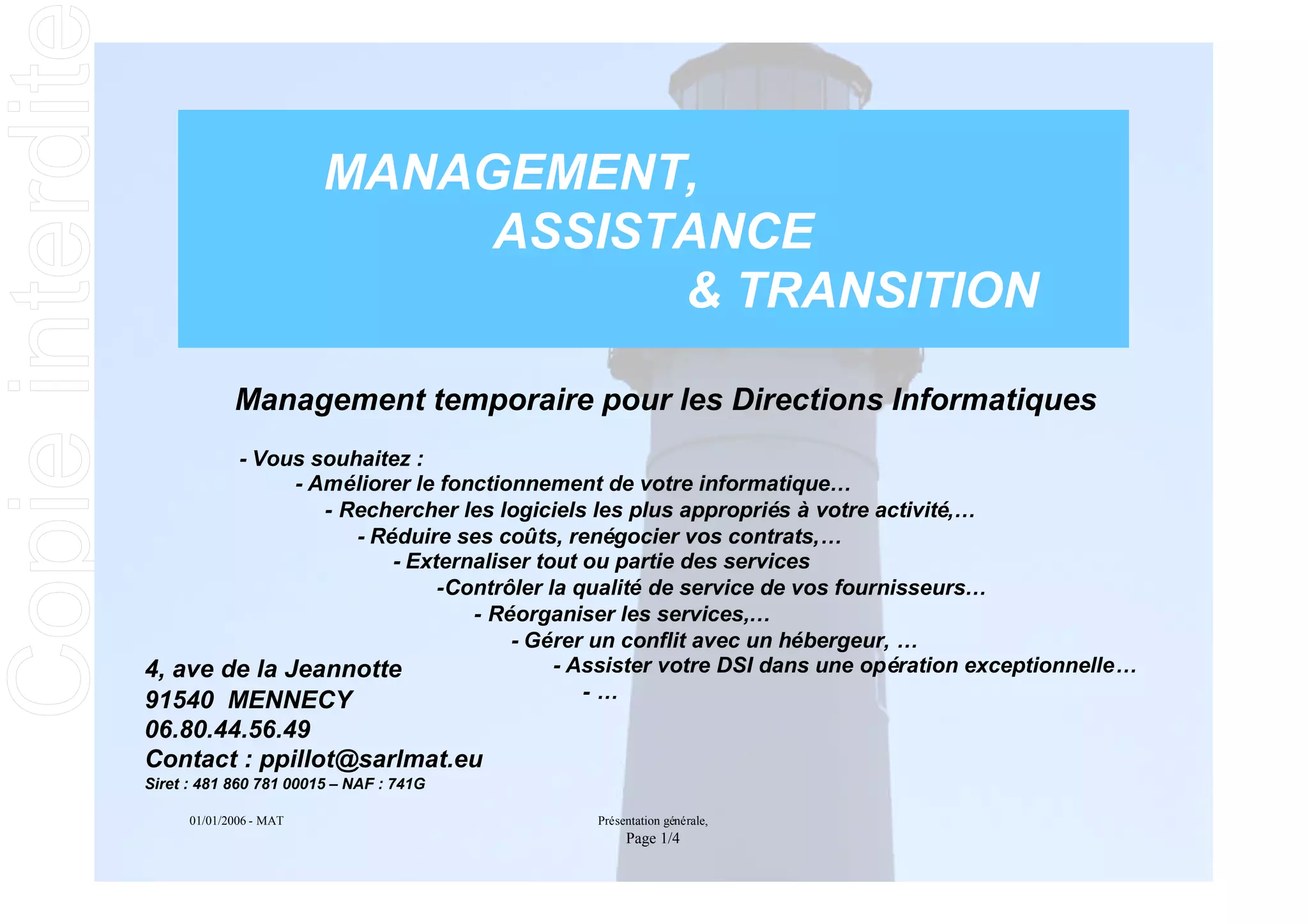 Le document présente des services de management, d'assistance et de gestion de transition pour les directions informatiques, incluant des audits, la renégociation de contrats, et l'externalisation de services. Il détaille également des interventions dans divers secteurs comme l'industrie, l'agriculture et les médias, en mettant en avant des références clés. Les compétences informatiques abordées comprennent la gestion des systèmes, des bases de données, et des ERP, avec un accent sur des solutions adaptées aux besoins des entreprises.