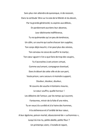 Ce poème exprime la souffrance et la solitude d'une personne, tout en évoquant la mémoire des plaisirs et des douleurs de la vie. Le texte souligne le désir de vivre et de retrouver des moments de bonheur, malgré les épreuves. L'auteur invite à surmonter la souffrance par un élan de danse et de vie, célébrant le présent et les souvenirs.