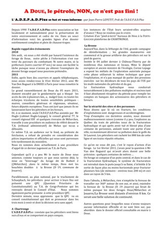 Le document traite des efforts de l'association ADEPAD+ pour lutter contre le forage de pétrole à Doue et la fracturation hydraulique, en dénonçant la désinformation et les manquements des autorités à fournir des informations essentielles. Il décrit les événements clés liés à cette lutte depuis 2010, y compris les rassemblements de soutien et les défis juridiques rencontrés. L'association s'inquiète des conséquences environnementales et de santé publique que pourrait engendrer l'exploitation pétrolière, tout en appelant à l'action et au soutien des citoyens.