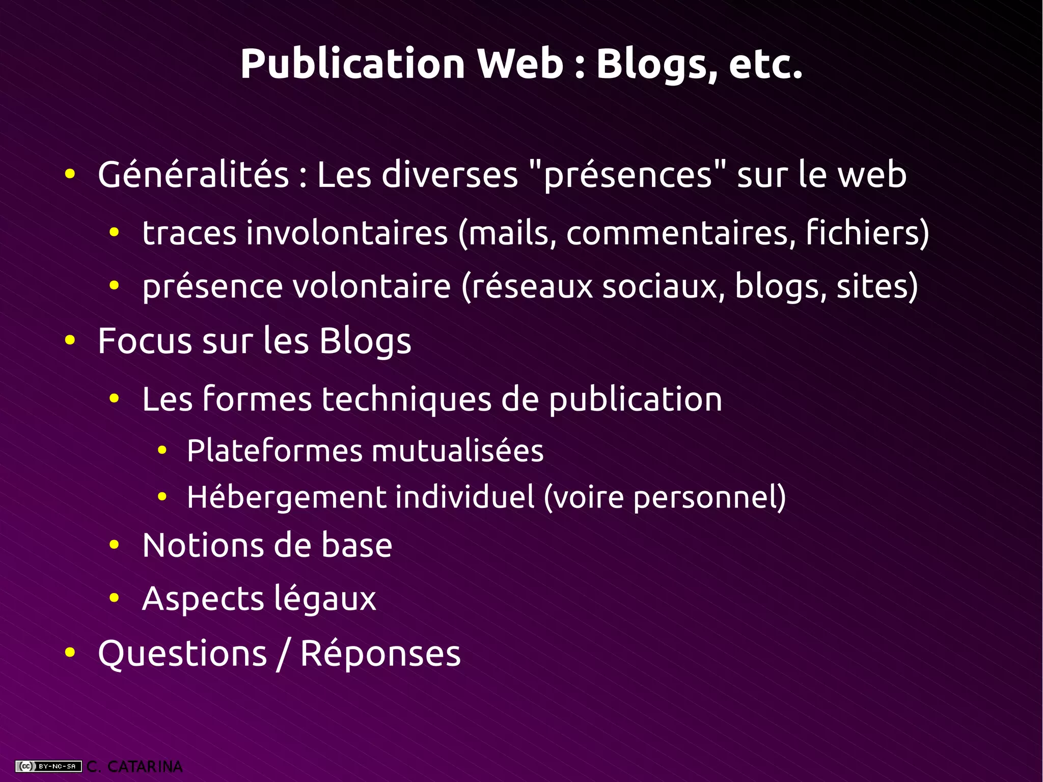 Le document traite de la présence sur le web, en se concentrant sur les blogs comme une forme de publication. Il aborde les types d'hébergements de blogs, leurs caractéristiques, ainsi que les aspects légaux liés à leur utilisation. Enfin, il propose des conseils pour choisir une plateforme de publication et les outils nécessaires pour gérer un blog.