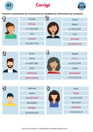 Le document présente une série de personnes avec leurs informations personnelles, y compris leur nom, date de naissance, lieu de résidence, profession et numéro de téléphone. Les individus mentionnés incluent Chantal Moreau, Bruno Morel, Louise Robert, Margot Moulin, Stéphane Martin et Rose Fleury. Le texte est structuré pour compléter des informations manquantes lors d'une écoute d'une présentation orale.