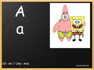 Le document présente les 26 lettres de l'alphabet français accompagnées d'exemples de mots illustratifs pour chacune. Chaque lettre est associée à un mot spécifique, facilitant l'apprentissage. Il contient également des références à un site web pour l'écoute et la répétition.