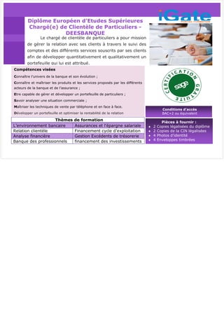 Le document présente les compétences visées pour le poste de chargé(e) de clientèle de particuliers, axées sur la maîtrise de l'environnement bancaire et des produits financiers, ainsi que sur la gestion de portefeuilles clients. Il détaille également les thèmes de formation nécessaires, tels que la relation clientèle, l'analyse financière et le financement. Enfin, il énonce les conditions d'accès et les pièces à fournir pour le diplôme requis.