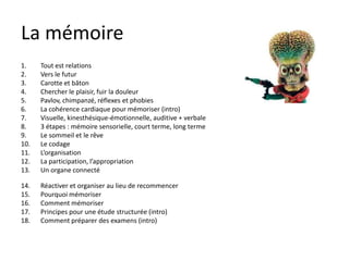 La mémoire humaine est une capacité essentielle d'établir et restituer des relations, influencée par des expériences passées et l'apprentissage futur. Les techniques de mémorisation incluent l'utilisation de plusieurs canaux sensoriels, la répétition à intervalles réguliers et l'organisation des informations. Une approche holistique qui combine soins du corps, gestion des émotions et méthodologie d'étude est cruciale pour améliorer la mémoire et l'apprentissage.