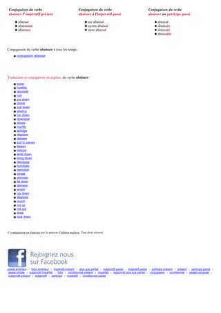 Le document fournit une liste détaillée de la conjugaison du verbe 'abaisser' en français à différents temps et modes, y compris indicatif, subjonctif et conditionnel. Chaque forme inclut des conjugaisons spécifiques pour les pronoms personnels. Il comprend également des traductions du verbe en anglais.