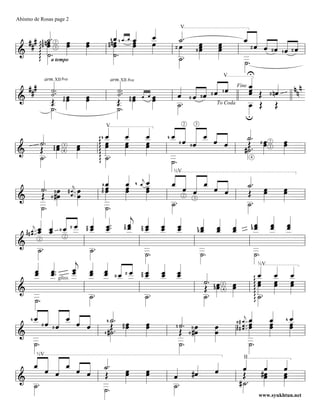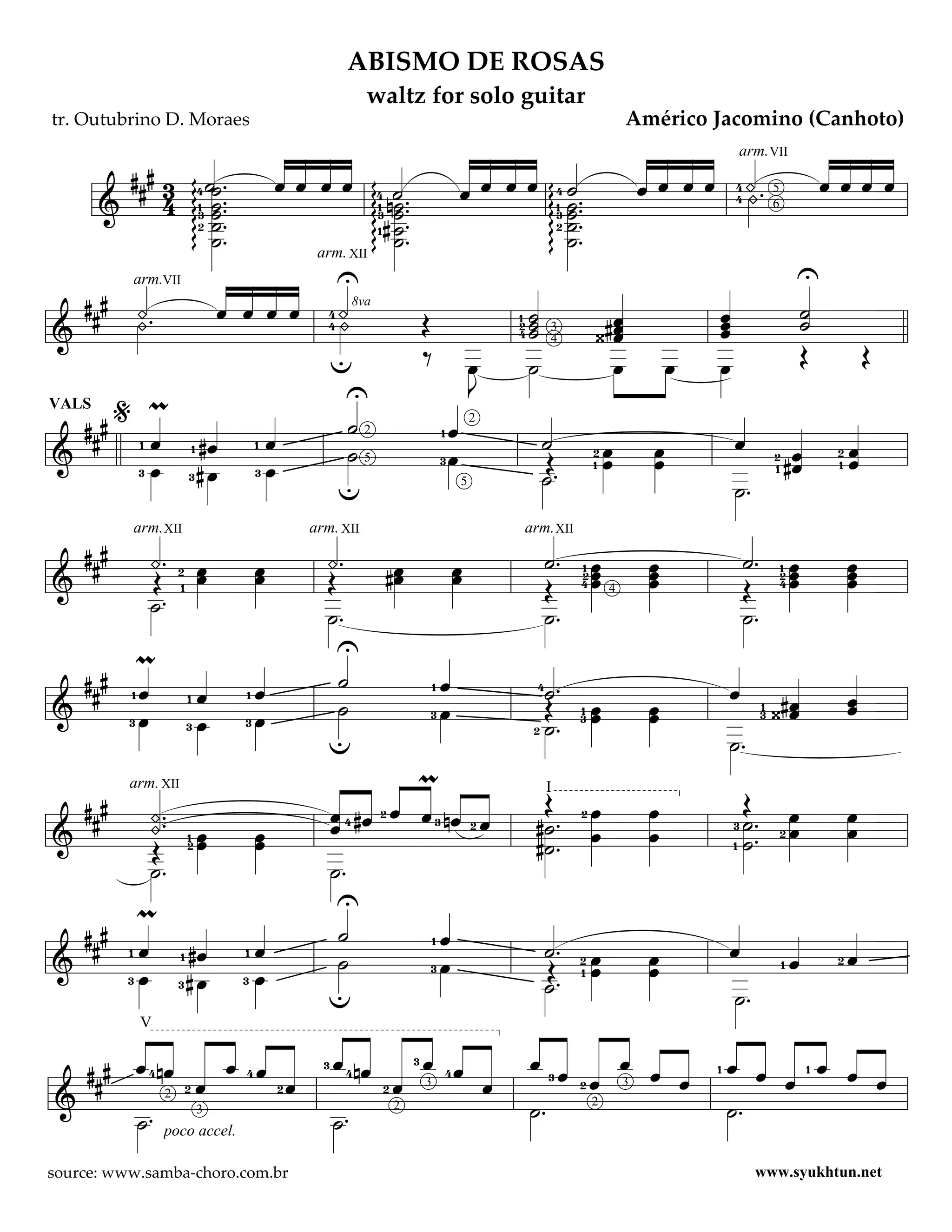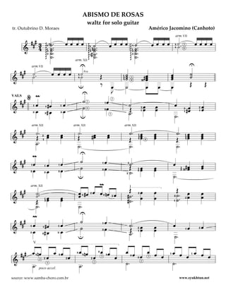Abismo de Rosas is a waltz arranged for solo guitar by Américo Jacomino, known as Canhoto. The document includes various musical notations, instructions for performance, and tempo markings designed for guitarists. It is a piece meant for formal performances, showcasing a blend of technical skill and expressive playing.