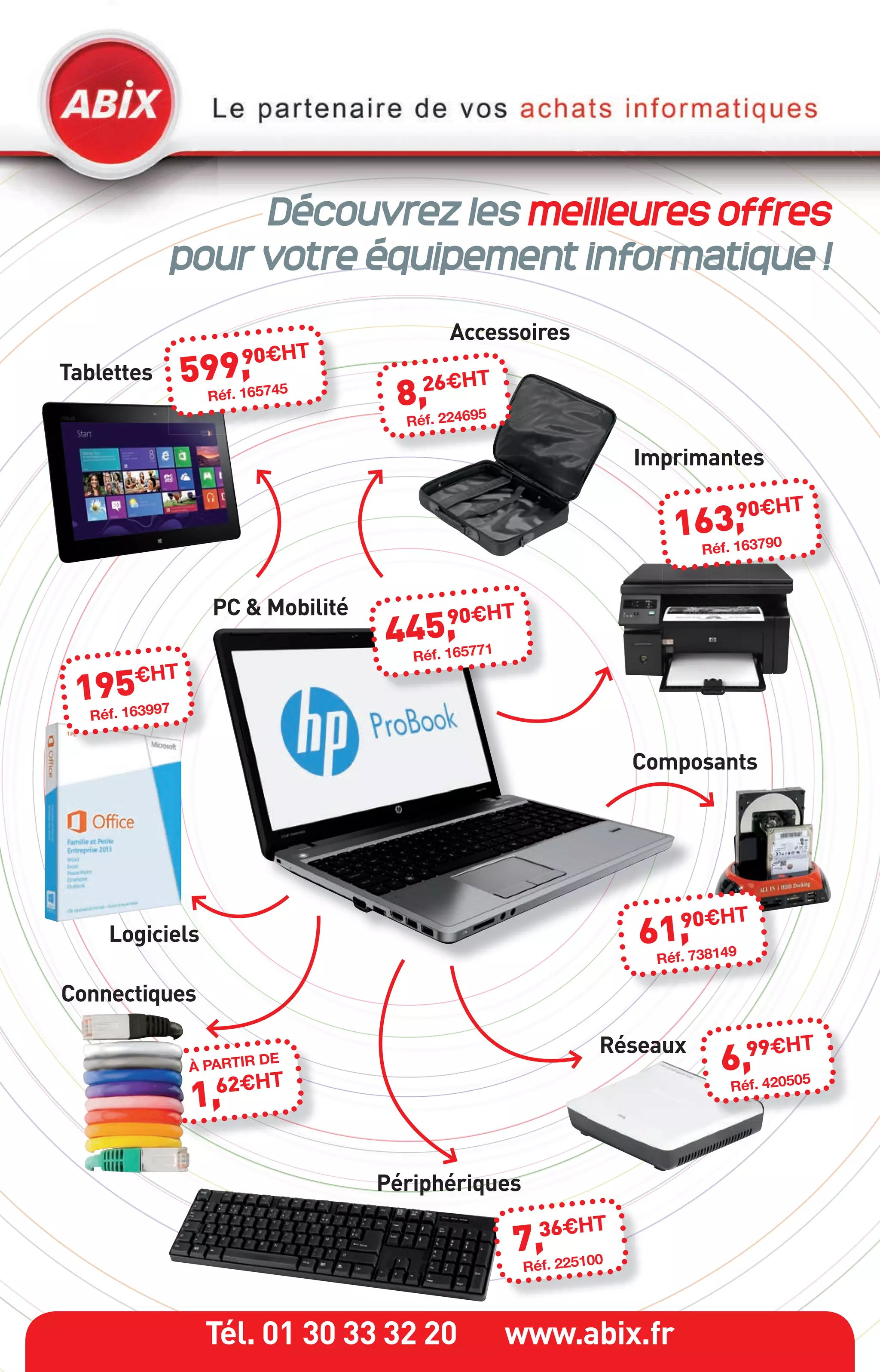Le document présente des offres et spécifications pour divers équipements informatiques, y compris des accessoires, des logiciels, et des tablettes, avec des détails sur les prix hors taxes. Il met également en avant des conseils pour choisir des tablettes en fonction de l'usage et des systèmes d'exploitation, tout en fournissant des informations sur la connectivité et les accessoires. Enfin, il décrit les différents types de portables et de PC en fonction des besoins des utilisateurs.