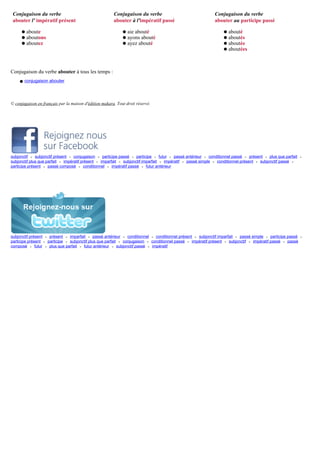 Le document contient une liste exhaustive des temps et modes de conjugaison du verbe 'abouter' en français, incluant l'indicatif, le subjonctif, le conditionnel et l'impératif. Il présente les conjugaisons à divers temps tels que le présent, l'imparfait, le passé composé, le futur et le passé simple. Chaque forme verbale est illustrée par des exemples de conjugaison appropriés.