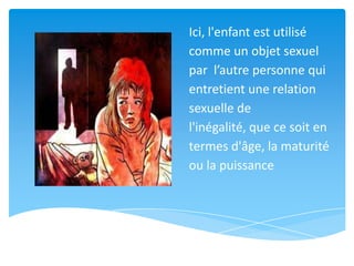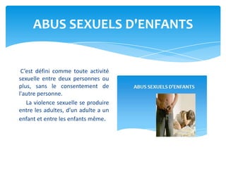 Les abus sexuels d'enfants incluent toute activité sexuelle non consensuelle impliquant un enfant. Cela se manifeste par des violences sexuelles entre adultes, d'un adulte vers un enfant, et entre enfants, où l'enfant est utilisé comme un objet sexuel. Ces actes engendrent des relations inégales basées sur l'âge, la maturité ou le pouvoir.