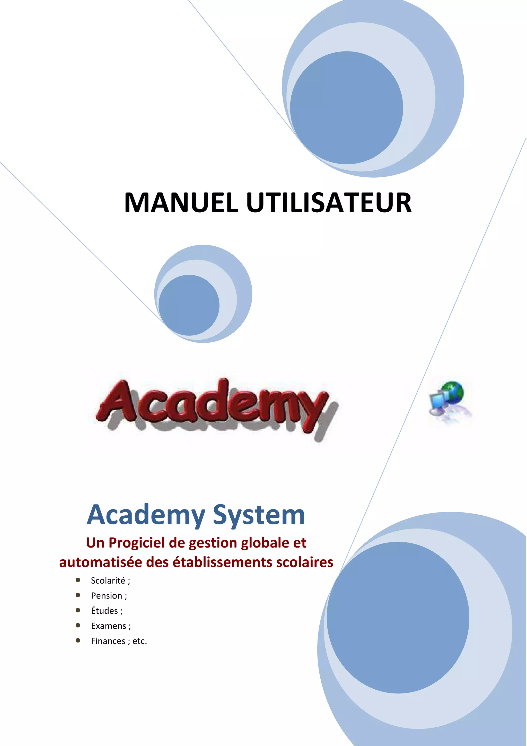 Le document est un manuel utilisateur pour le logiciel Academy System, une solution de gestion globale dédiée aux établissements scolaires. Il couvre des sujets tels que l'installation, la configuration de l'application, et les différents modules (scolarité, pension, études, examens, finances, etc.). Academy System vise à simplifier la gestion des établissements scolaires en centralisant plusieurs tâches administratives et financières.