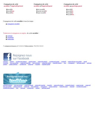 Le document fournit la conjugaison complète du verbe 'accabler' en français à tous les temps et modes, y compris indicatif, subjonctif et impératif. Il inclut également des exemples de conjugaison pour chaque temps, ainsi que des traductions en anglais. Ce guide est une ressource utile pour ceux qui souhaitent maîtriser la conjugaison de ce verbe.