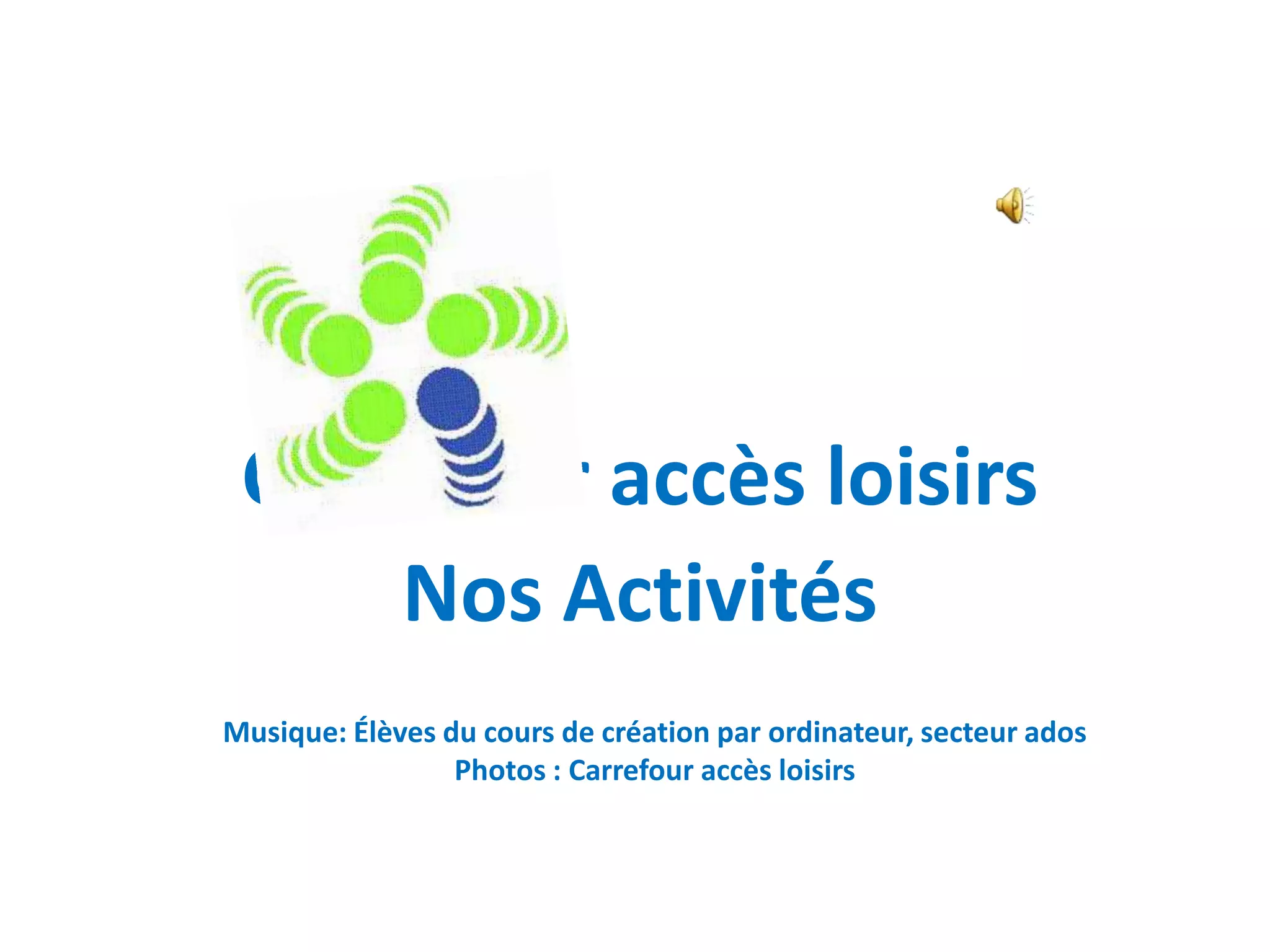 Carrefour Accès Loisirs propose une programmation variée d'activités sportives, artistiques et culturelles pour tous les âges, ainsi que des camps d'été et des événements spéciaux. L'équipe est composée d'animateurs, de professeurs et de bénévoles attentionnés. L'objectif est de créer un milieu sympathique où les participants peuvent s'épanouir.