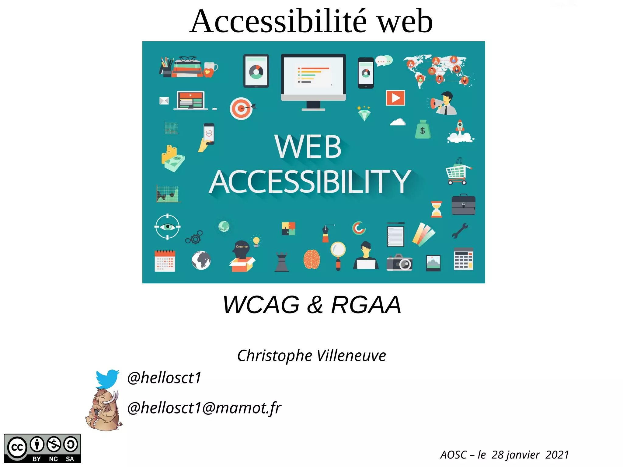 Le document traite de l'accessibilité numérique, précisant les normes WCAG et RGAA, qui visent à rendre les sites web accessibles aux personnes handicapées. Il couvre les directives de conception, les meilleures pratiques en développement HTML/CSS, et liste des outils pour valider l'accessibilité, tels que des extensions Firefox. Christophe Villeneuve y présente également des exemples concrets et des thématiques essentielles liées à l'accessibilité web.
