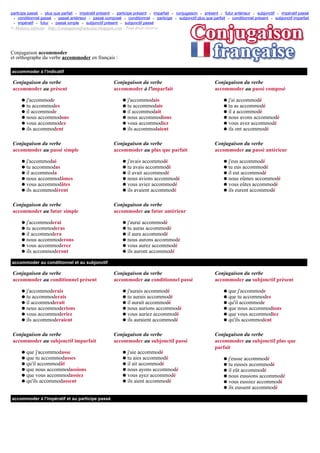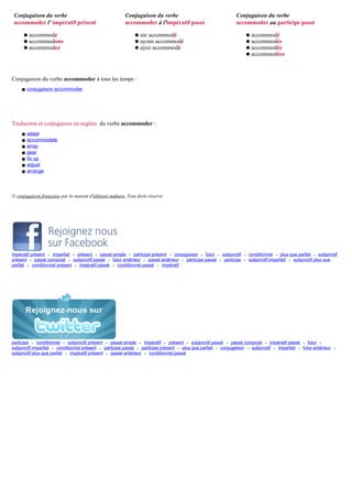 Le document présente la conjugaison du verbe 'accommoder' à divers temps et modes en français, y compris les temps indicatifs, conditionnels et subjonctifs. Il fournit des exemples concrets pour chaque forme verbale. De plus, il inclut une section sur la traduction de 'accommoder' en anglais.