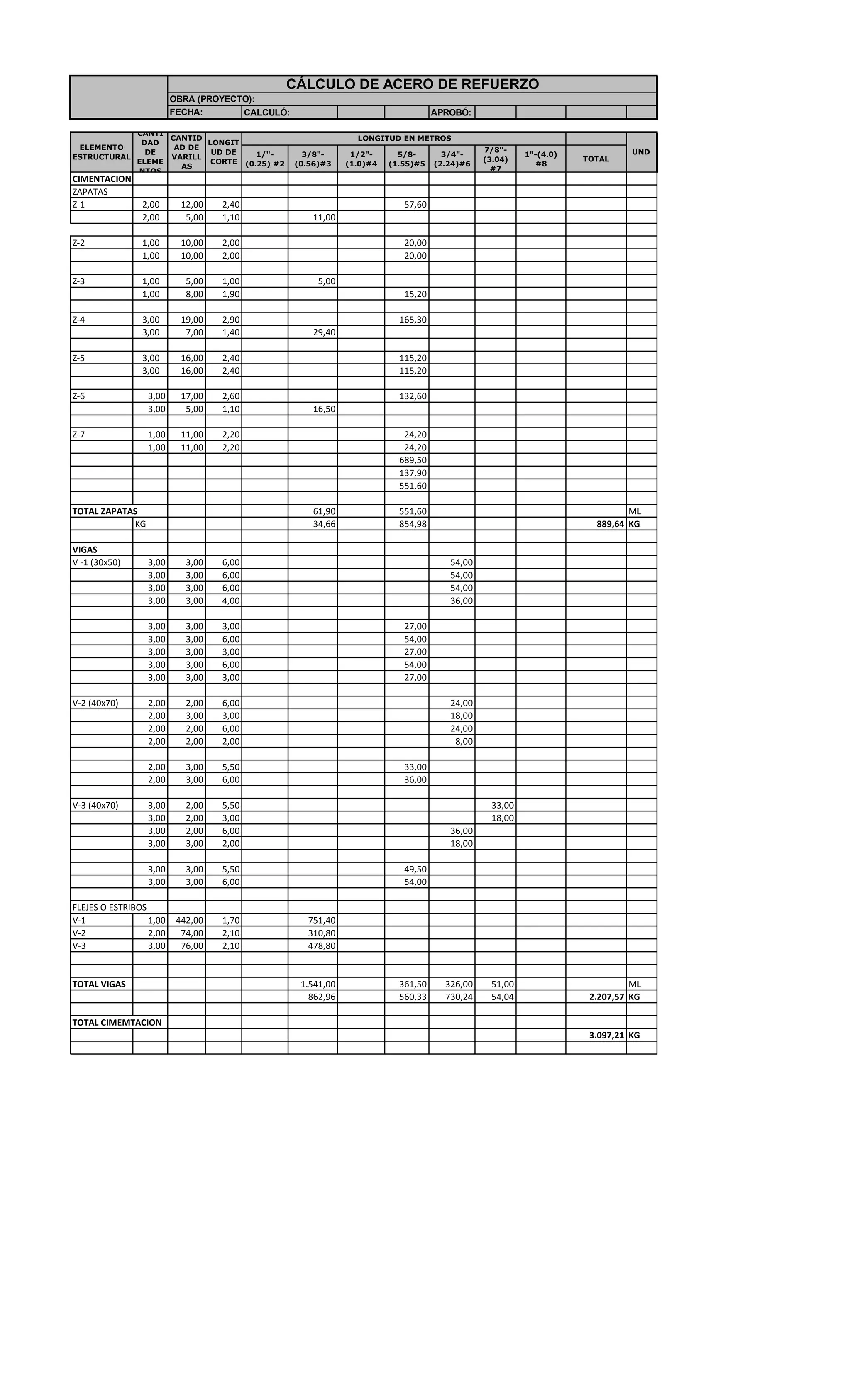 Le document contient des calculs détaillés concernant les matériaux nécessaires pour la construction d'une structure, y compris les fondations, les colonnes et les poutres. Il présente des quantités spécifiques de ciment, d'acier et d'autres matériaux, ainsi que les dimensions et longueurs requises pour chaque élément. Les totaux de volume et de poids des matériaux sont également fournis.