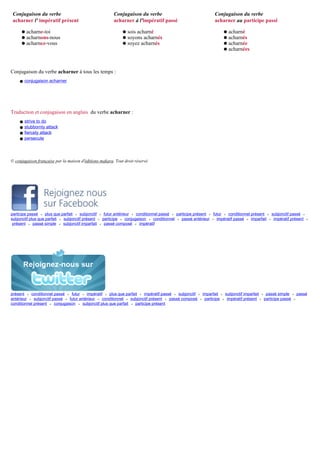 Le document présente la conjugaison du verbe 'acharner' à différents temps et modes en français, dont le présent, passé composé, imparfait, futur et conditionnel. Chaque forme verbale est clairement exposée avec des exemples appropriés. Il inclut également la traduction anglaise du verbe et les droits d'auteur des éditions Makara.