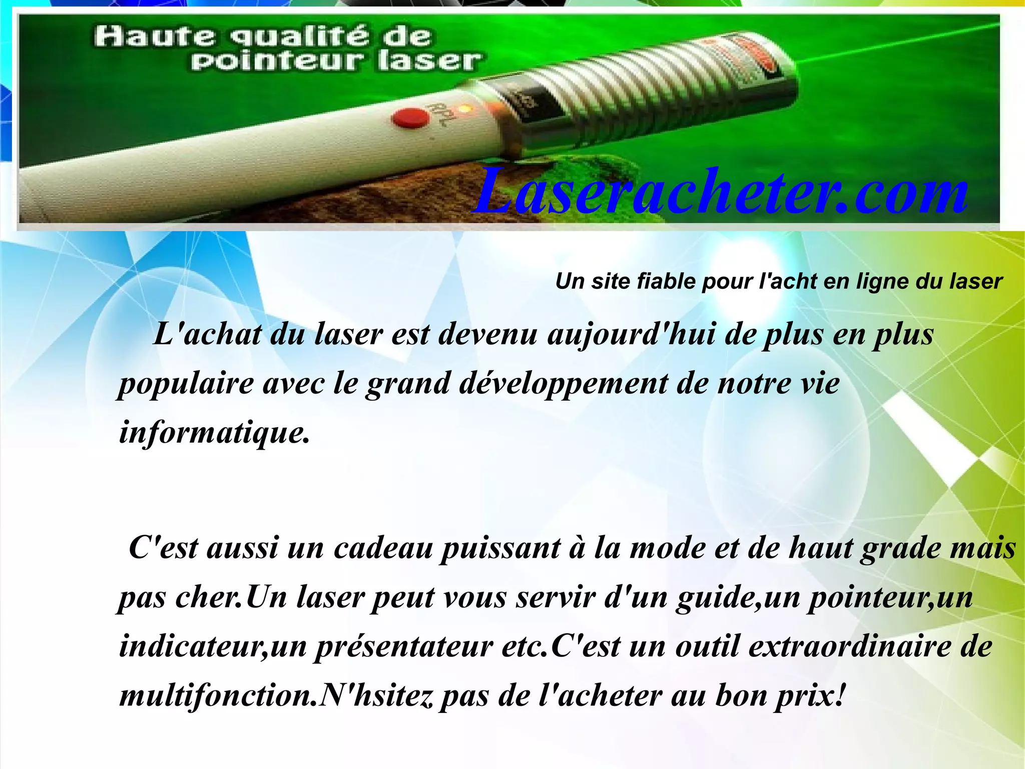 Le site laseracheter.com propose une large gamme de lasers pour différents usages, allant de l'enseignement aux loisirs en plein air. Les lasers, notamment rouges, verts, bleus et violets, sont disponibles à des prix abordables et ont des applications variées, de la présentation professionnelle à l'astronomie. Le site met en avant la puissance et la visibilité de ses produits, adaptés à divers besoins des utilisateurs.