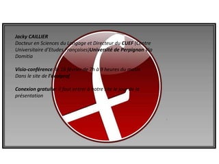 Jacky Caillier, docteur en sciences du langage et directeur du CUEF à l'université de Perpignan Via Domitia, présentera une visio-conférence le 16 février sur les mots et expressions de l'imaginaire culturel de l'histoire de France dans les chansons françaises. La session se déroulera de 7h à 9h du matin et l'accès est gratuit via leur site. La présentation inclura également des informations sur les séjours linguistiques et culturels organisés pour professeurs et étudiants.