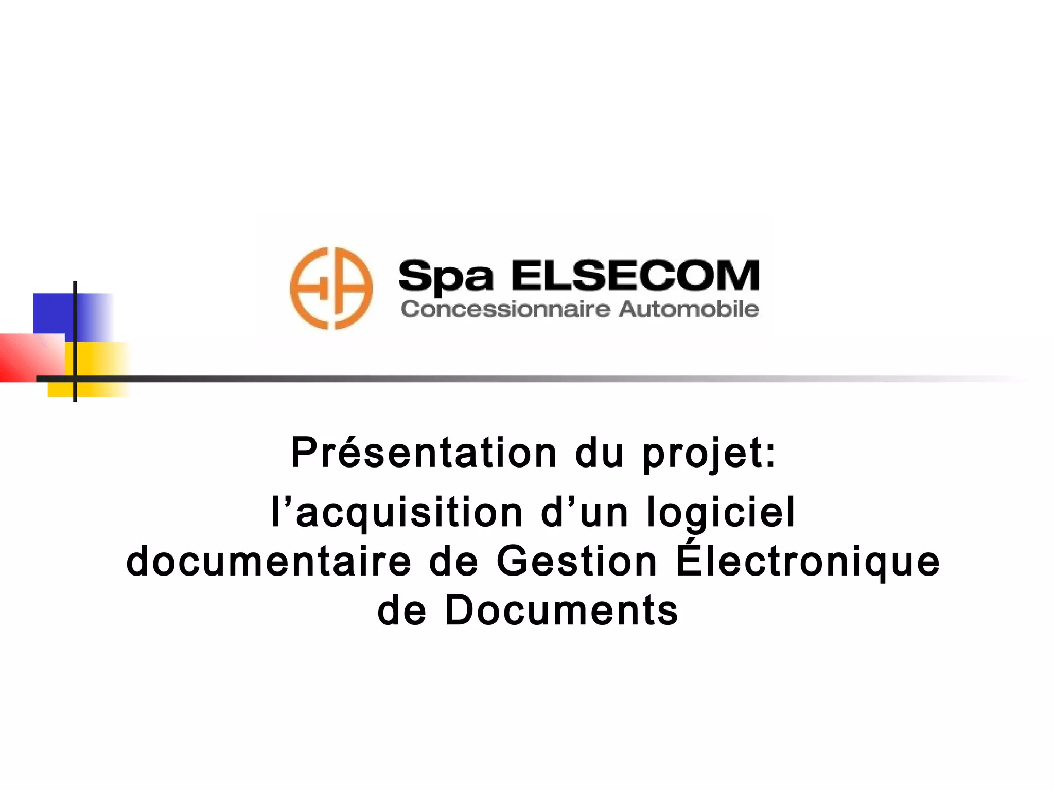 Le projet concerne l'acquisition d'un logiciel de gestion électronique de documents (GED) pour le siège d'Elsecom à Bab Ezzouar, visant à centraliser et sécuriser la documentation de l'organisation. Les objectifs incluent l'accessibilité, la traçabilité et la gestion efficace des droits d'accès, tout en assurant l'interopérabilité avec les outils existants. La mise en place nécessitera un accompagnement comprenant la formation, la sauvegarde des données et le paramétrage du logiciel.