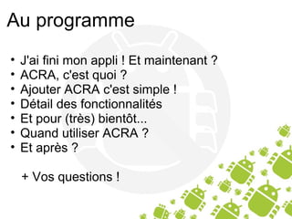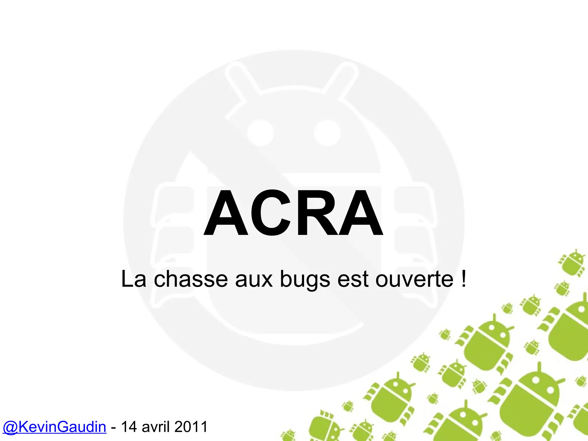 ACRA est un outil open source facilitant la gestion des rapports de crash pour les applications Android en envoyant des données de plantage vers Google Docs. Il propose plusieurs modes d'interaction et permet d'envoyer des informations personnalisées, avec de futures mises à jour visant à améliorer les capacités d'analyse et d'intégration. ACRA est utile en phase test et en production pour surveiller les problèmes et assurer une meilleure expérience utilisateur.
