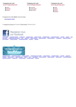 Le document présente la conjugaison du verbe 'acérer' en français à différents temps et modes, y compris le conditionnel, le futur et le subjonctif. Il fournit des exemples de conjugaison à tous les temps, tant à l'indicatif qu'à l'impératif et au participe. Les informations sont organisées de manière exhaustive pour chaque forme verbale.