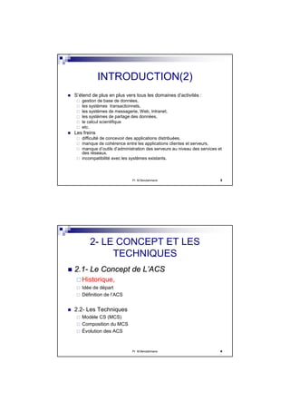 L'architecture client-serveur est le produit d'évolutions technologiques récentes et s'étend à divers domaines tels que les systèmes de gestion de données et de messagerie. Elle offre des avantages tels qu'une centralisation des ressources et une évolutivité, mais présente aussi des inconvénients notamment en termes de charge serveur et de technicité requise. Le modèle client-serveur repose sur une interaction entre clients, qui demandent des services, et serveurs, qui les fournissent, permettant ainsi une architecture distribuée efficace.