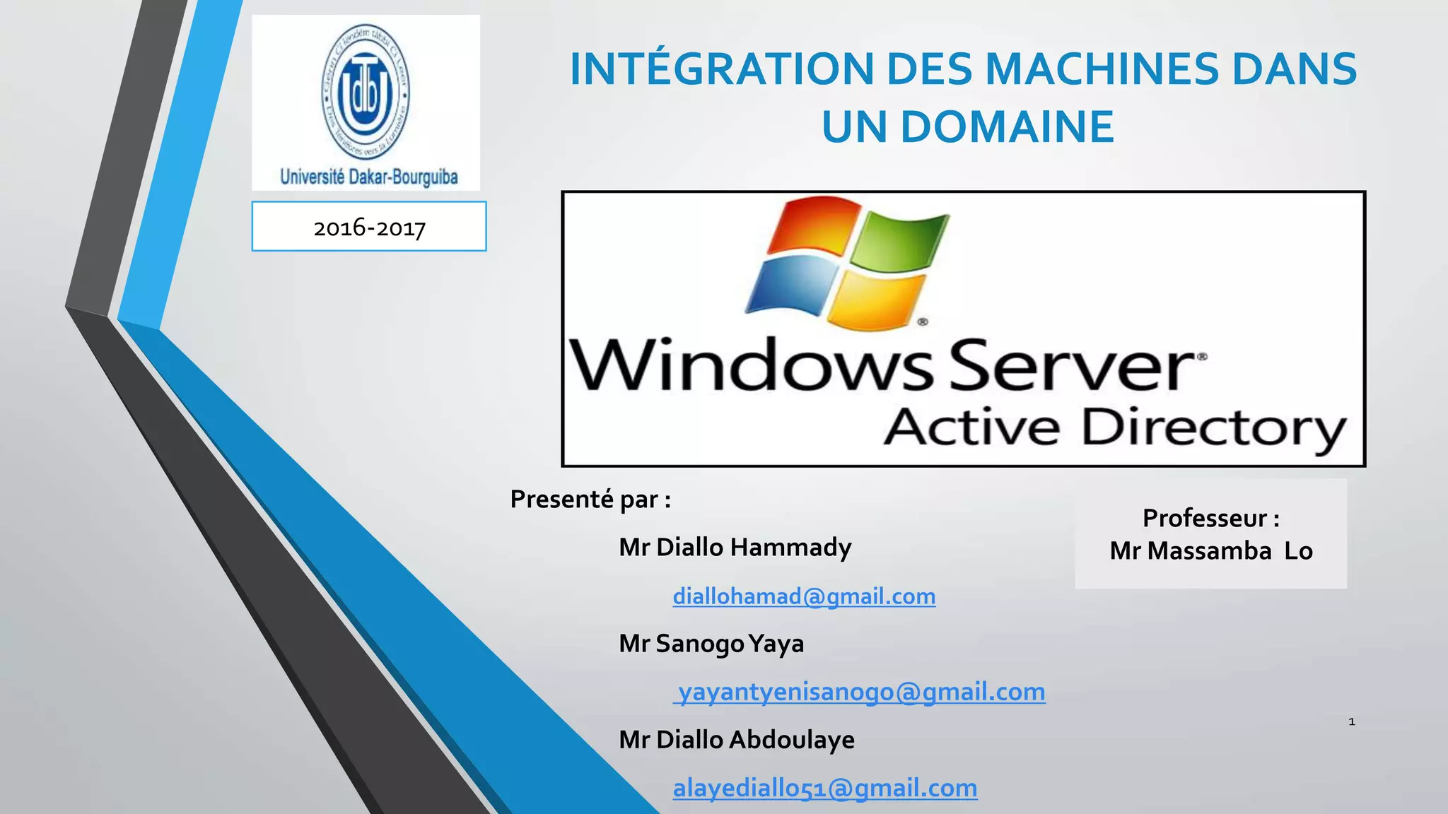 Le document présente l'intégration de Microsoft Active Directory, une solution essentielle pour la gestion des utilisateurs, machines et applications au sein des entreprises. Il explique comment configurer Active Directory sur Windows Server 2012 ou 2016, ainsi que les applications permettant la centralisation des informations réseau. En conclusion, Active Directory est crucial pour l'administration et la sécurisation des réseaux informatiques, tout en optimisant les coûts d'exploitation.