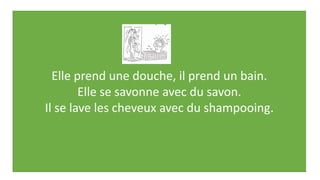 Le document décrit les routines d'hygiène et de beauté de deux personnes. Elle prend une douche et se maquille, tandis qu'il prend un bain et se rase. Ils se regardent dans la glace après s'être préparés.