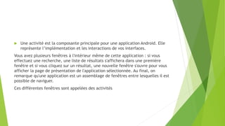 Une activité est la composante principale d'une application Android, représentant les interfaces et les interactions à travers plusieurs fenêtres. Chaque activité contient un contexte qui la relie au système Android et aux autres activités, et elle hérite de la classe Activity. La gestion du cycle de vie des activités implique de redéfinir certaines méthodes clés, bien que cela ne soit pas toujours nécessaire.