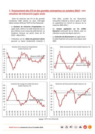 En octobre 2014, la trésorerie des ETI et grandes entreprises en France est jugée aisée, tandis que les prix à la consommation enregistrent une hausse minime de 0,3%, le rythme le plus faible depuis 2009. La production industrielle connaît une contraction de 0,2% en août, par rapport au mois précédent, et les défaillances d'entreprises affichent une baisse de 3,1% sur trois mois, mais une hausse de 1,5% sur douze mois. Enfin, 18% des sociétés de 50 salariés ou plus en France ont recours à la sous-traitance internationale, représentant 27% des salariés.