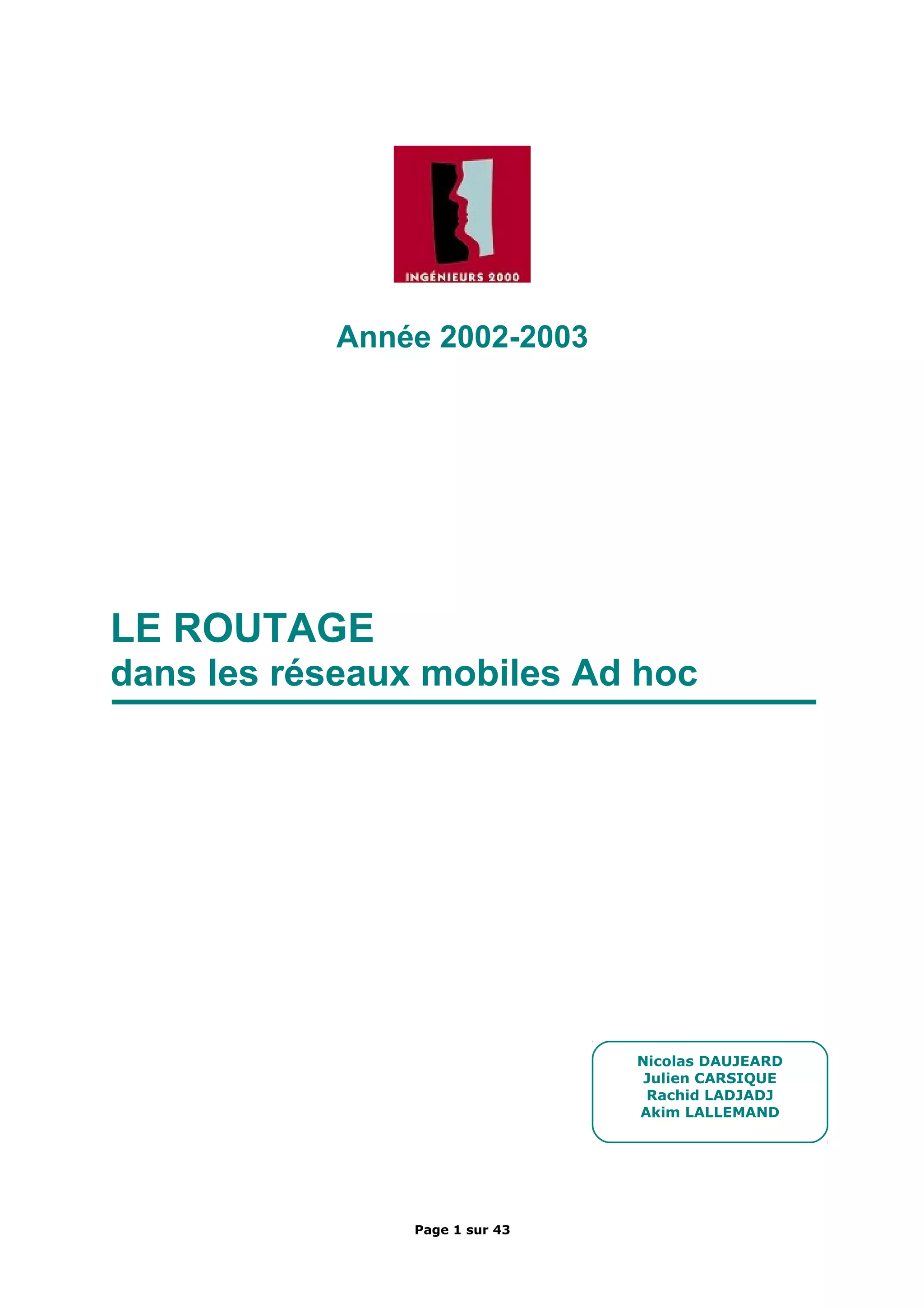 Ce document traite du routage dans les réseaux mobiles ad hoc, en présentant les environnements mobiles, les caractéristiques des réseaux ad hoc et les défis associés au routage. Il explore différents protocoles de routage, tant proactifs que réactifs, en mettant en lumière leurs spécificités et leurs applications. L'étude souligne la complexité du routage dans ces contextes, due à l'absence d'infrastructure fixe et à la mobilité des nœuds.
